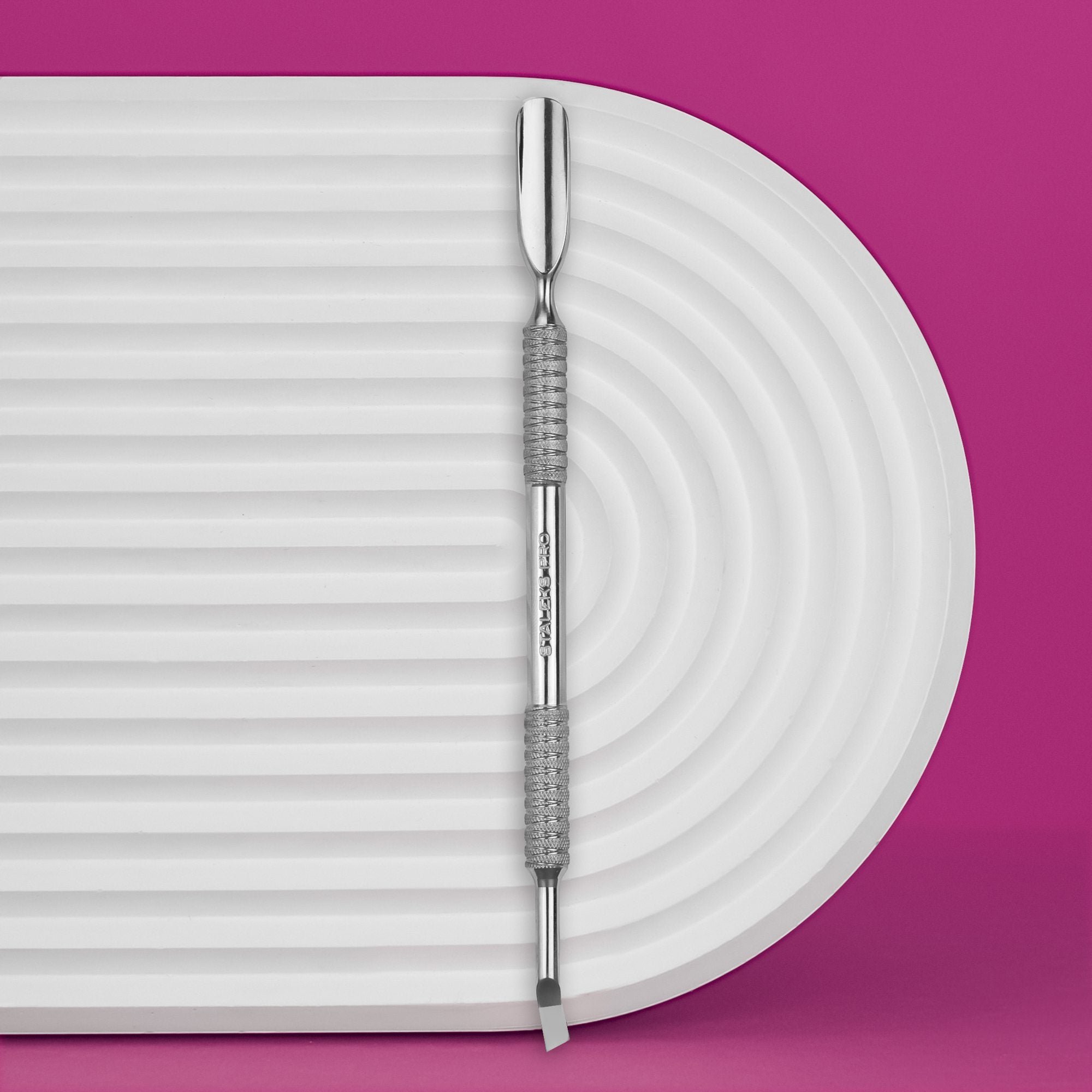 Zaobljeni široki potiskivač, zaobljena oštrica.Prikladan nagib oštrice.Veći potiskivač za šire ploče nokta.Profesionalno ručno oštrenje.Preporuča se i za manikuru i za pedikuru.Masivna neklizajuća ručka za izvrsno držanje.Dodatna otpornost na koroziju zahvaljujući poliranju s GOI brusnom pastom.Nehrđajući čelik AISI 420.