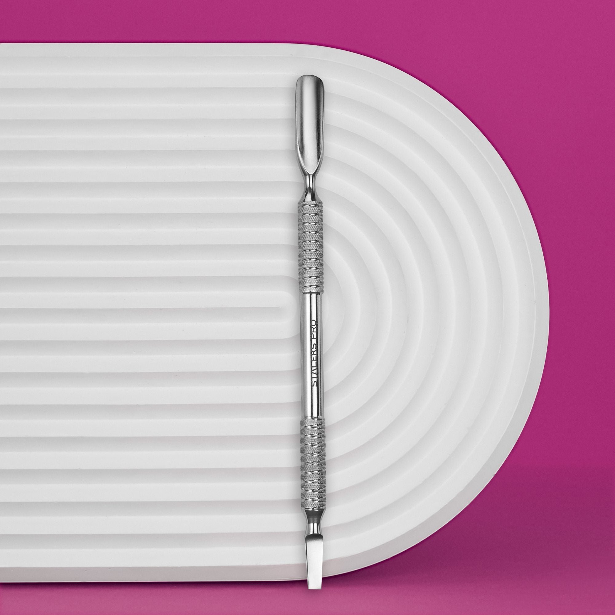 Zaobljeni široki potiskivač, oštrica.Snažna oštrica za masivno nakupljanje zanoktica.Veći potiskivač za šire ploče nokta.Profesionalno ručno oštrenje.Preporuča se i za manikuru i za pedikuru.Masivna neklizajuća ručka za izvrsno držanje.Dodatna otpornost na koroziju zahvaljujući poliranju s GOI brusnom pastom.Nehrđajući čelik AISI 420.